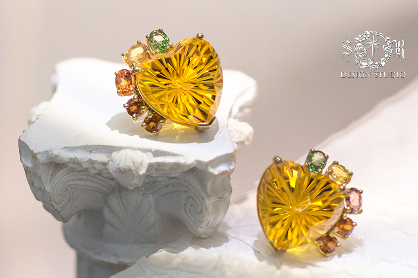 以秋日麦浪与暖阳为意象,主石黄水晶澄澈如光晕,周围镶嵌天然彩色蓝宝石,呈现如渐变田野般的和谐色调。9K金镶嵌与18K金耳针结合,在耳际构筑出既有自然温度又不失现代精致的小型艺术品。