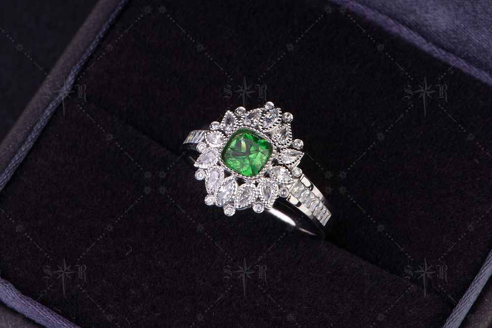 以一颗小巧沙弗莱为心,翠绿如晨露凝簇,周围环以繁密小钻,皆以辘珠边细镶,纹理精微如蕾丝花边。