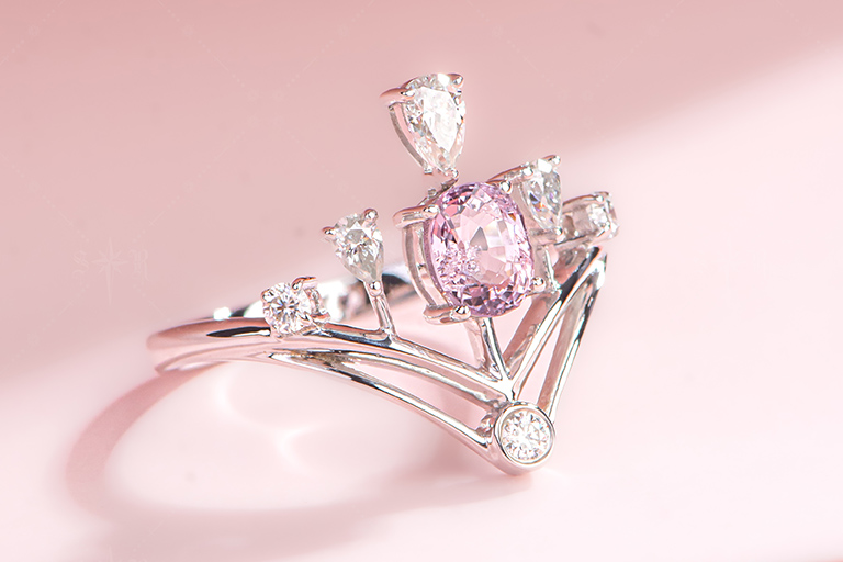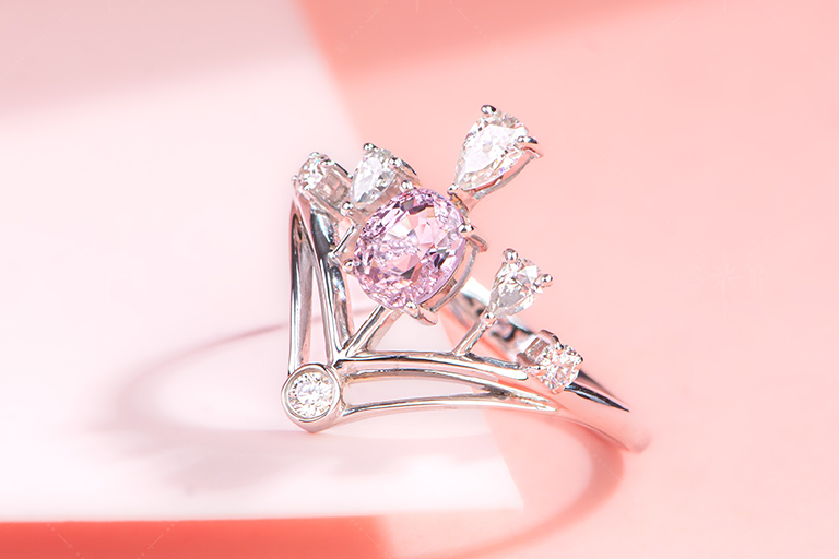 以一抹粉色系蓝宝石为心,像春日花蕊在指间悄然绽放;V字形轮廓如向上延展的光线,视觉上拉长手指线条,极为显手长且利于叠戴组合。