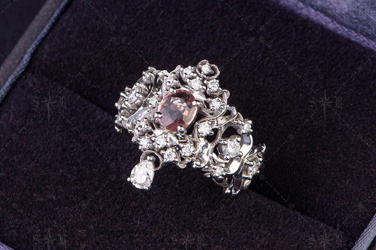 如同蕾丝般精致的金属花纹在指间绽放,中央那枚温润的粉色尖晶石恰似晨曦里的一抹柔光,周围以莫桑钻点缀成繁密的花环,重金镶嵌带来沉稳的质感与宫廷般的华丽。