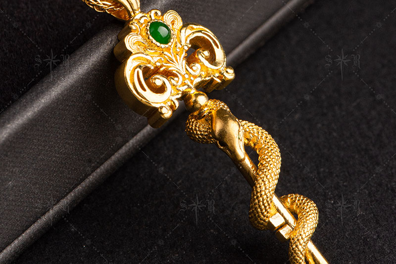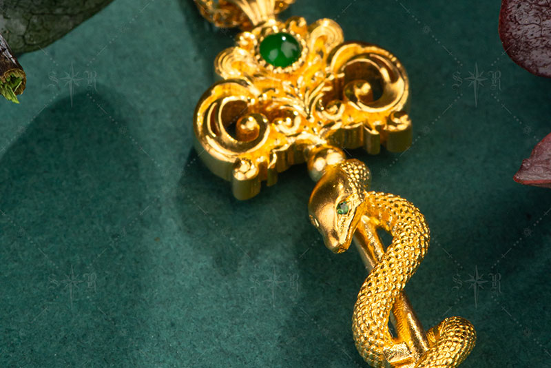 足金以暖重的光泽托起一段古老的符饰,细密的蛇鳞在金面上被雕琢得有着节奏感与呼吸,金身盘绕如同守护与力量的古老誓言。中央点缀一颗温润翡翠,碧色如林间深泉,在金色光晕中透出清冷与生气,冷暖相融,既有东方玉器的温婉,又有西方徽章的刚劲。