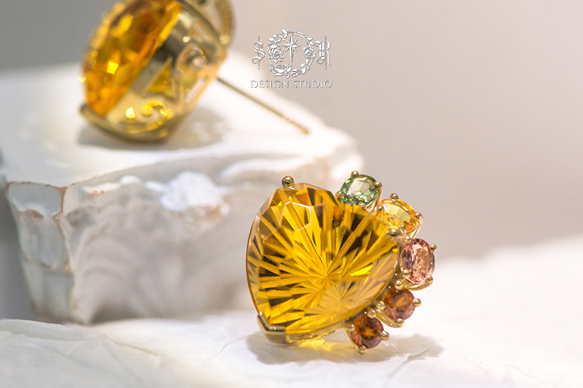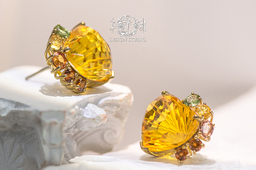 以秋日麦浪与暖阳为意象,主石黄水晶澄澈如光晕,周围镶嵌天然彩色蓝宝石,呈现如渐变田野般的和谐色调。9K金镶嵌与18K金耳针结合,在耳际构筑出既有自然温度又不失现代精致的小型艺术品。