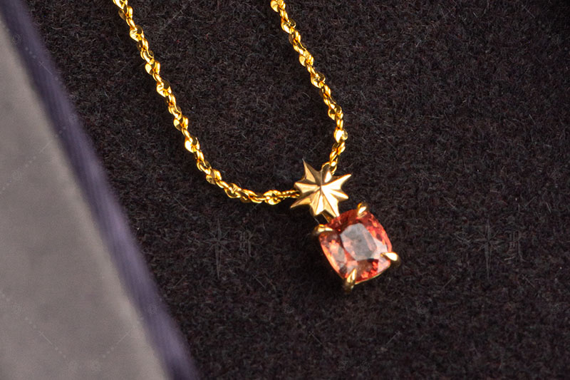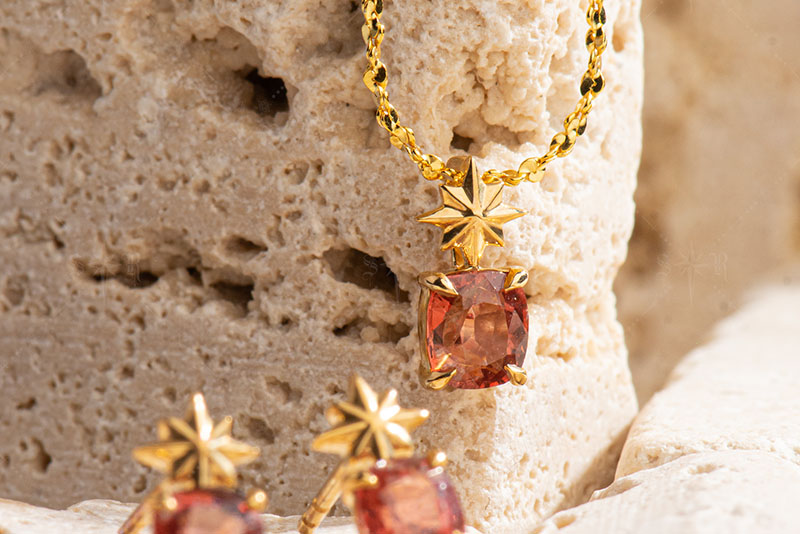 以夏日夕阳与夜空星影为源,将一颗缅甸尖晶石打造成如夕焰般温暖的主石,辅以小巧星形金饰点缀,呈现轻奢又俏皮的夏日风情。18K金托底既保证光泽感也兼顾佩戴舒适。