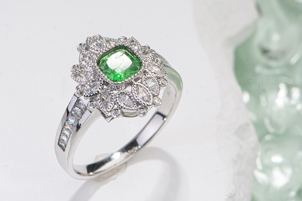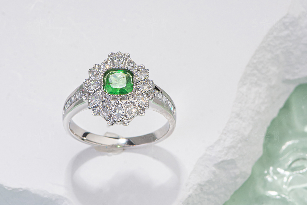 以一颗小巧沙弗莱为心,翠绿如晨露凝簇,周围环以繁密小钻,皆以辘珠边细镶,纹理精微如蕾丝花边。