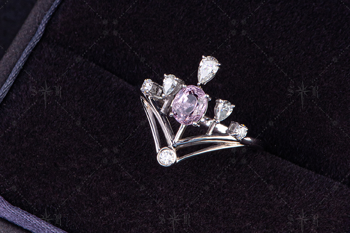 以一抹粉色系蓝宝石为心,像春日花蕊在指间悄然绽放;V字形轮廓如向上延展的光线,视觉上拉长手指线条,极为显手长且利于叠戴组合。