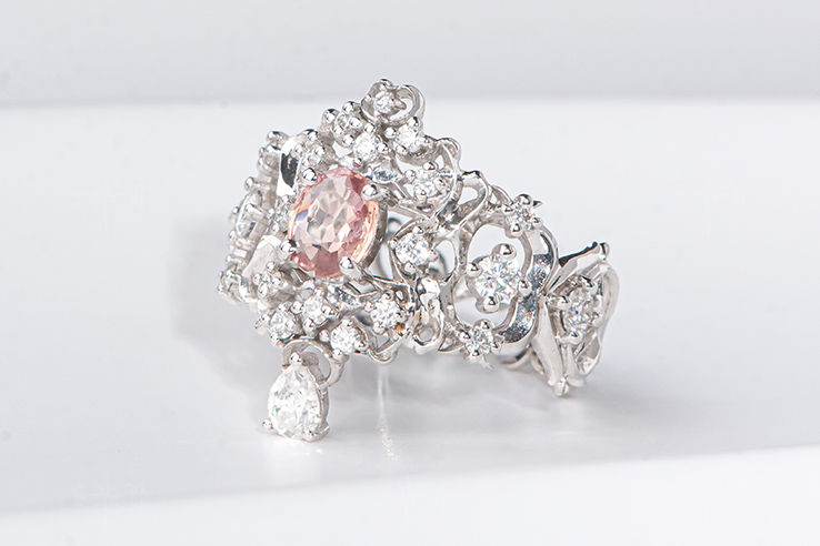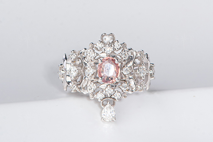 如同蕾丝般精致的金属花纹在指间绽放,中央那枚温润的粉色尖晶石恰似晨曦里的一抹柔光,周围以莫桑钻点缀成繁密的花环,重金镶嵌带来沉稳的质感与宫廷般的华丽。