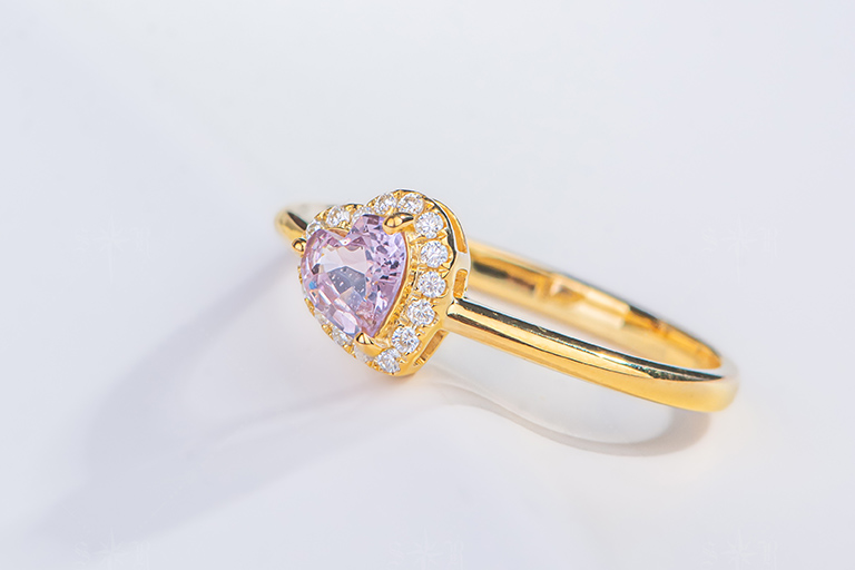 不规则的爱心像手写的情书,带着一点任性与温柔。 中央那枚帕帕拉恰蓝宝石泛着独特的粉橙调,像是黄昏里的一抹羞涩;周围以密集小钻环绕,围钻如光的微粒,在指间流动,既闪耀又不张扬。 9K金细致托镶,线条纤细轻盈,适合日常单独佩戴或与其他戒指叠戴,呈现出甜美而大方的气质。 现为14号戒圈,可按需改圈,既是自赏也可作礼赠,给平凡日子添一抹温柔光芒。 此款为我们原创常规可选款,现有一枚成品现货。 若需更换主石可联系客服定制同款(主石需另行购买)。 直接选款定制,不仅可以免设计费,而且出货更快;同时因主石不同,最终成品虽款式相同,却每一枚都是独一无二的。 我们可按您的戒圈号重新建模,材质可选9k/14k/18k,欢迎咨询匹配您心意的宝石。